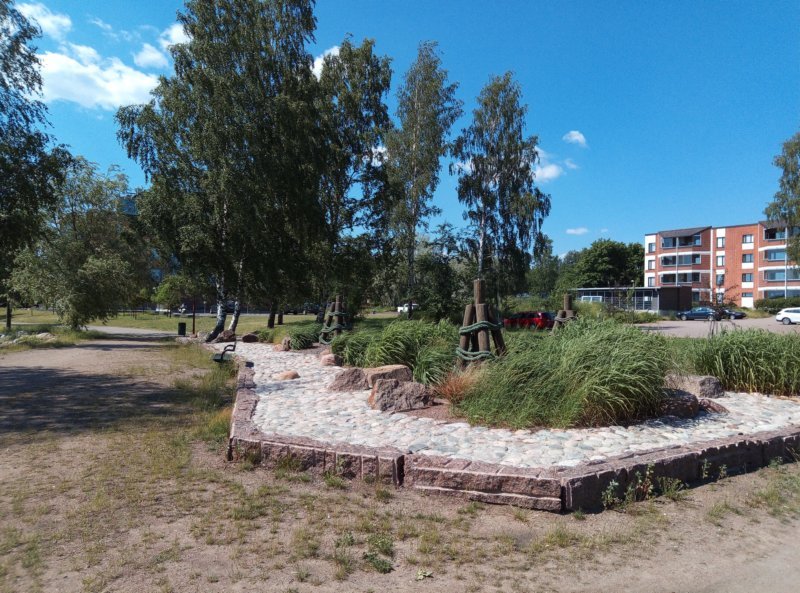 Lahdella olleita diktaaleja jäljittelevät hirsirakennelmat kytkevät puiston alueen historiaan.